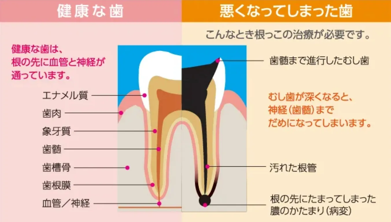 齲蝕(むし歯)が歯髄(神経)まで達し、不可逆的な炎症や感染が起きた場合です。放置すると根尖(根の先)に病巣が広がるため、抜歯を回避する目的で、感染した歯髄を除去・清掃する必要があります。