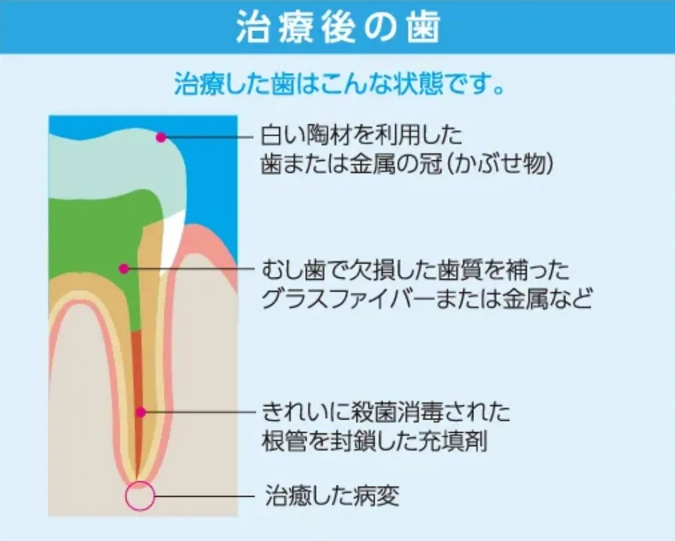 細菌に侵された神経を取り除き、根の中を消毒・洗浄した上で薬剤を詰めて密閉することで、再発を防ぎます。