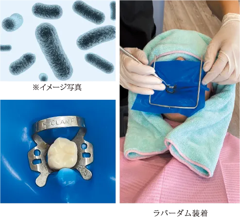 根の病気の原因は、お口の中の細菌です。根の中に細菌が入らないよう、細心の注意を払わなければなりません。 治療中のラバーダム使用はもちろんのこと、治療期間中に細菌が歯の中に侵入しないよう、徹底した管理を行います。